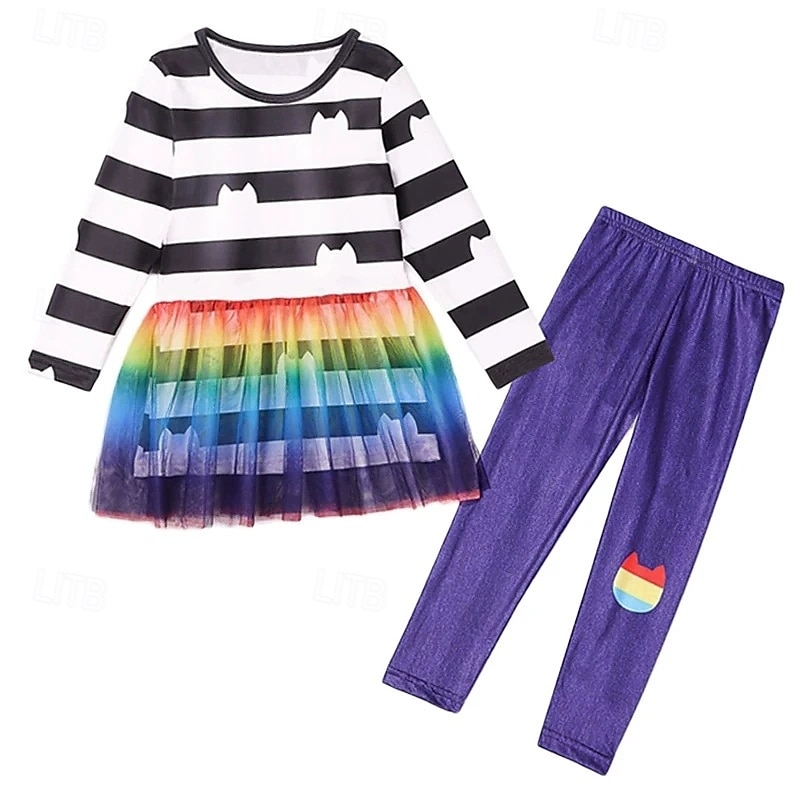 HOT ! 3 Pieces Kids Girls' Stripe Pants Suit Set Long Sleeve Fashion Outdoor 4 years+ Summer Rainbow Set Rainbow Set+Hairband Black White Set+Hairband