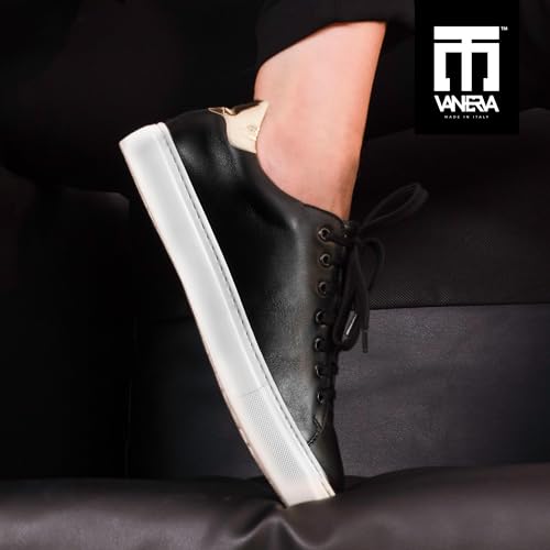 • HANDCRAFTED ITALIAN LEATHER; Experience the difference that genuine European craftsmanship makes with these womens black sneakers from VANERVA; Our black sneakers for women have an authentic Italian calfskin exterior that’s supple, yet durable; What’s more, these womens fashion sneakers are entirely handmade and use only Italian materials for a noticeably more comfortable shoe that puts the competition to shame