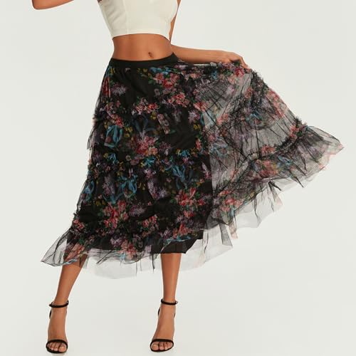 HOT ! Women's Velvet Floral Mesh Skirt Elastic High Waist Double Layered Midi Skirt 3D Floral Print Tutu Tulle Skirt