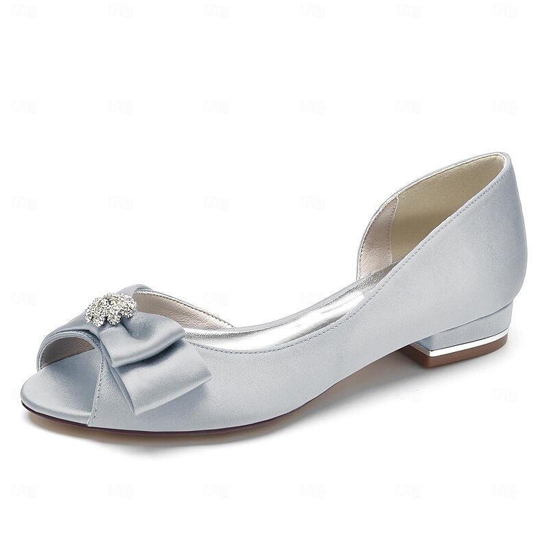 Highlights [Fabric] : Crafted from luxurious satin, these women's wedding shoes exude a soft and elegant sheen that is perfect for formal occasions, providing a sophisticated backdrop for their exquisite design. [Silhouette] : Featuring a classic peep-toe design, these shoes incorporate a flat heel for enhanced comfort and stability, allowing for extended wear during weddings or evening events without compromising on style. [Design Highlights] : The shoes are adorned with a striking bow embellishment at the open toe, embellished with a delicate rhinestone at the center, adding a subtle sparkle and enhancing their elegant appeal. [Occasions] : Ideal for weddings, parties, and daily wear, these shoes combine elegance and practicality, making them a versatile choice for brides, bridesmaids, or anyone attending festive gatherings and weddings. [Size Notice] : Available in various sizes ranging from US6/EU36/UK4/CN36 to US11.5/EU43/UK9.5/CN45, these shoes are designed to fit standard sizes, so select your usual size for a comfortable fit.