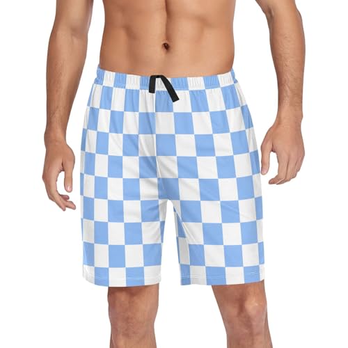 HOT ! Men's White and Blue Checkered Pajama Shorts with Pocket and Drawstring S