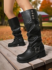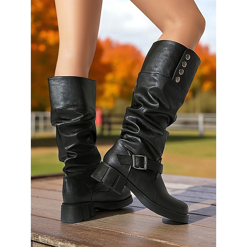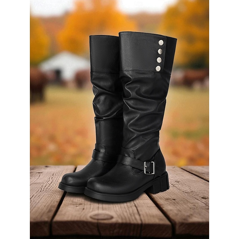 Highlights - Trendy faux leather upper material - Soft and comfortable textile lining - Stylish buckle embellishment - Chunky heel for stability and style - Classic round toe shape - Durable rubber outsole - Stay on trend with 2025 riding boots fashion