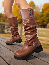 More information about Women's Brown Faux Leather Slouch Knee High Boots - Chunky Heel Riding Style with Buckle Strap and Metal Button Accents for Outdoor Casual Activities and Streetwear
