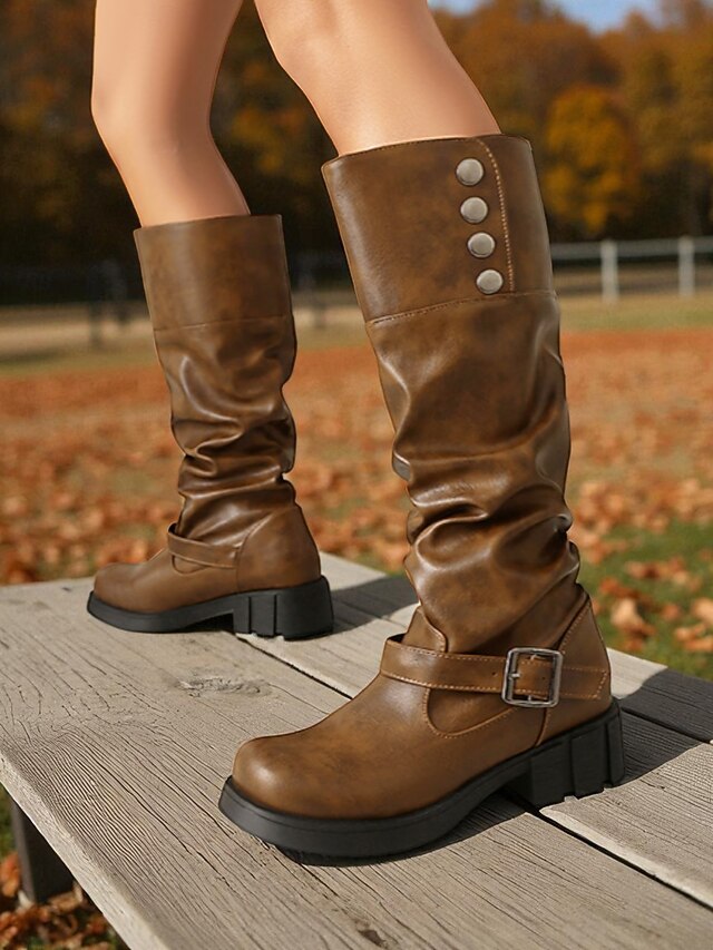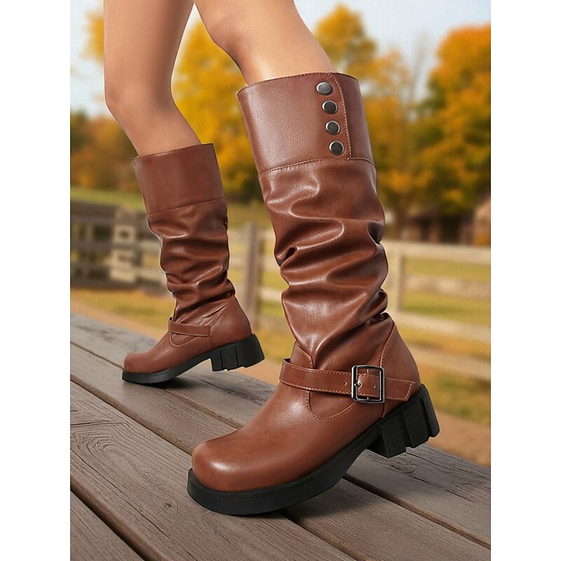 HOT ! Women's Brown Faux Leather Slouch Knee High Boots - Chunky Heel Riding Style with Buckle Strap and Metal Button Accents for Outdoor Casual Activities and Streetwear