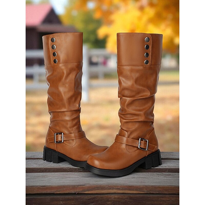 Women's Brown Faux Leather Slouch Knee High Boots - Chunky Heel Riding Style with Buckle Strap and Metal Button Accents for Outdoor Casual Activities and Streetwear 1