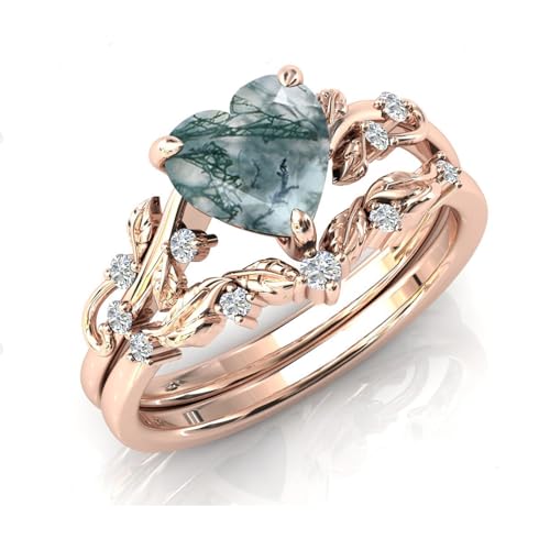 HOT ! Natural Heart Moss Agate Engagement Black Ring Set for Women 925 Sterling Silver Genuine Green Moss Agate Bridal Rings Set for Her Moss Agate Promise Wedding Ring Set, balck