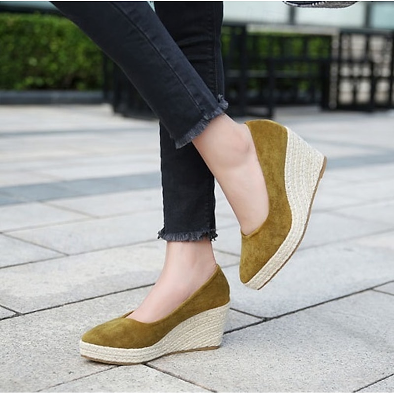 Highlights [Fabric] : Crafted from premium satin, these women's wedge heels offer a lustrous and sleek look, ensuring both durability and softness for a comfortable wear. [Style] : Featuring a minimalistic design, the pointed toe and solid color pattern create an elegant and timeless aesthetic, suitable for various outfits and occasions. [Design Highlights] : The wedge heel is skillfully wrapped in natural jute, offering a unique texture and providing a stable, comfortable lift. The slip-on loafer style ensures convenience and a secure fit, making these shoes a practical yet chic choice. [Occasions] : Perfect for daily wear, whether you're heading to work, a casual outing, or a semi-formal event. These wedges add both height and style while maintaining comfort throughout the day. [Size Range] : Available in a range of sizes, from US5.5 to US10, ensuring a suitable fit for various foot sizes and personal preferences.