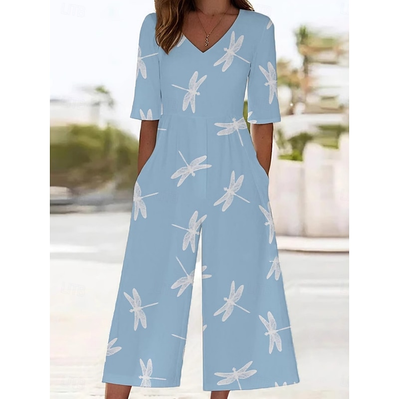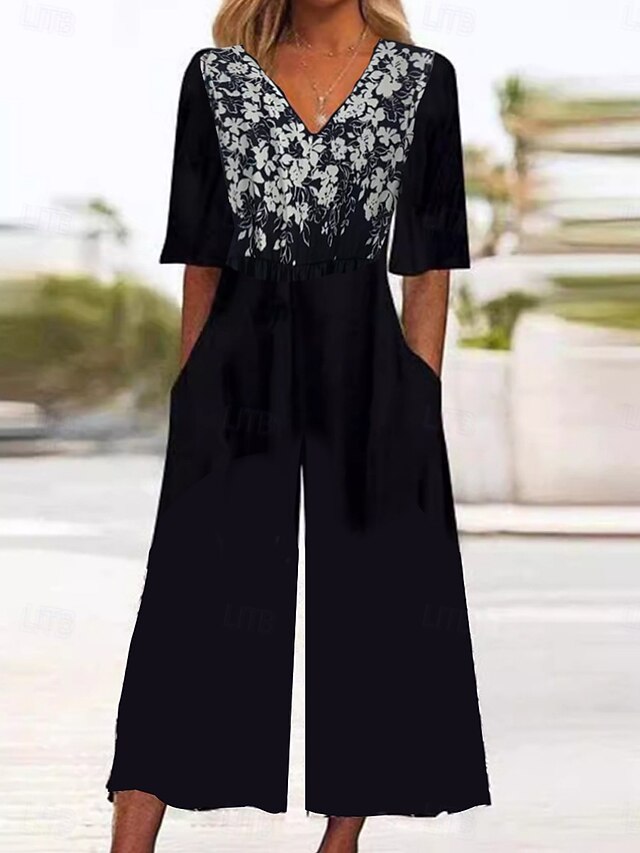 HOT ! Women's Normal Jumpsuit Active Floral 3/4 Length Sleeve Wide Leg V Neck High Waist Vacation Daily Regular Fit Black Red Blue Summer