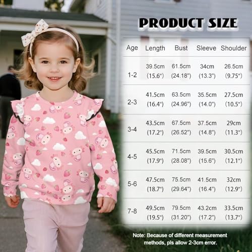 • CUTE RUFFLE SHOULDER: Kids pullover sweatshirt features a comfortable crewneck design, long sleeve, loose casual pullover tops, cute and fashion styles, elastic cuffs for easy on and off, and cute ruffles on the shoulders. The exquisite design details add a touch of playfulness, making your little one look cute and charming
