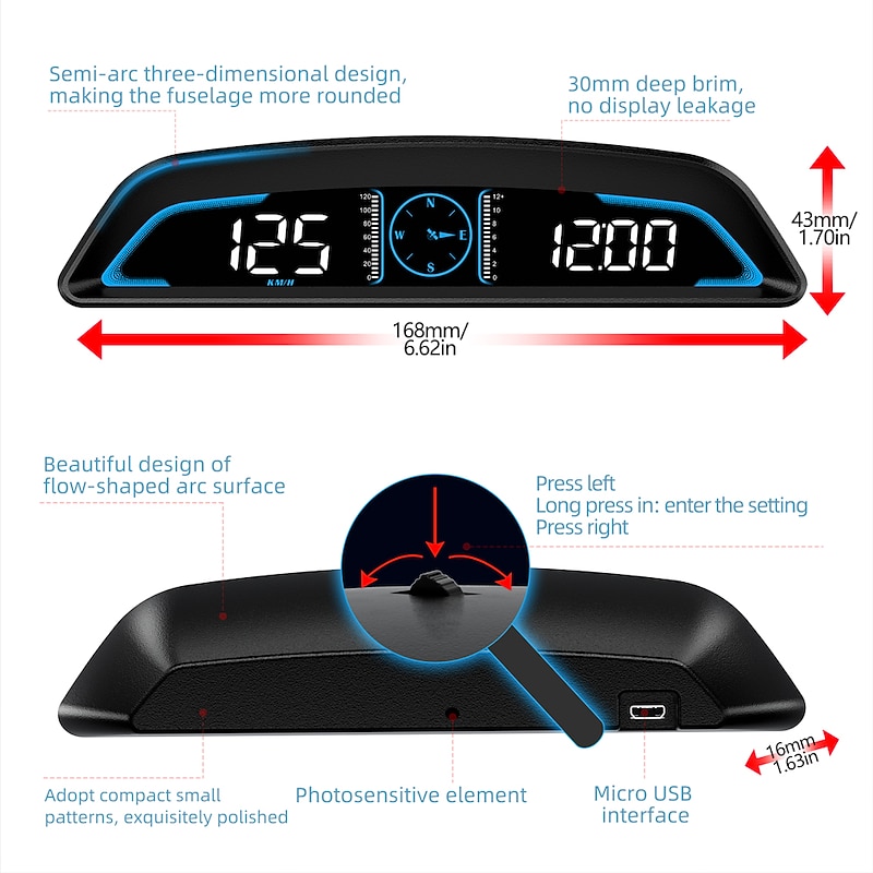 Highlights - Extra large 5.5inch screen for easy visibility - Displays important MPH data, driving time, mileage, time, and direction simultaneously - Two scales display speed and number of satellites respectively - Compass in the middle indicates direction - Driving safety alerts for speeding and fatigued driving with ticking sound reminders and break reminders - HD data display with automatic light-sensitive screen that adjusts to external light for the clearest data - Technology processing chip provides smooth high-speed operation for real-time data follow-up - Easy one key operation and a warranty included - Cannot accumulate total distance driven with power off - Brightness can be adjusted automatically or manually with long and short presses of the wheel button.