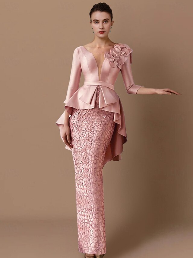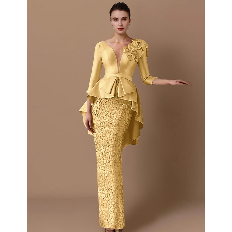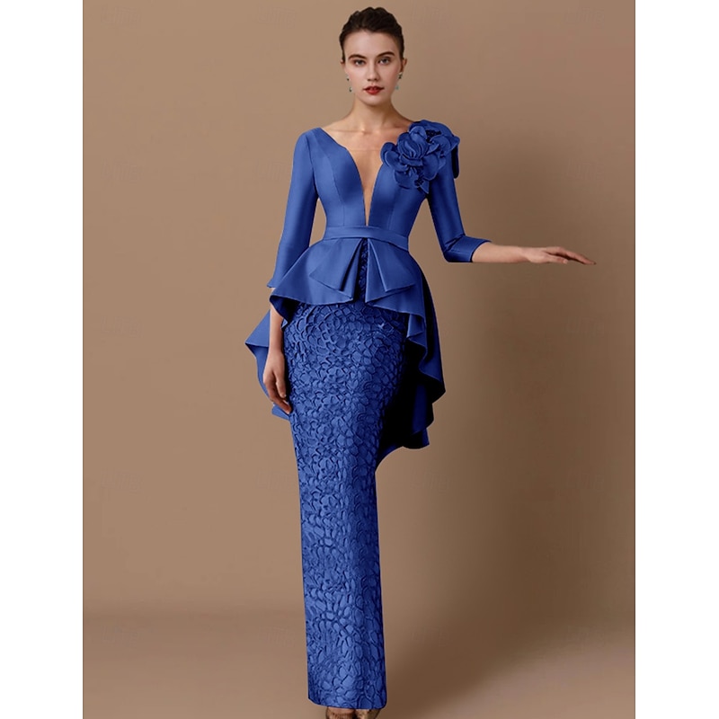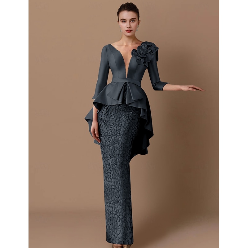 More information about Sheath Mother of the Bride Dress Wedding Guest Elegant Party V Neck Floor Length Satin Lace 3/4 Length Sleeve with Appliques Cascading Ruffles Flower