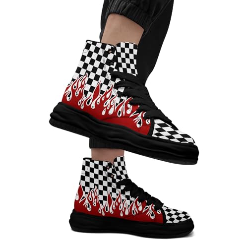 Checkered Flame High-Top Platform Sneakers, Custom Chunky Elevated Canvas Trainers for Streetwear Race Casual Footwear 6
