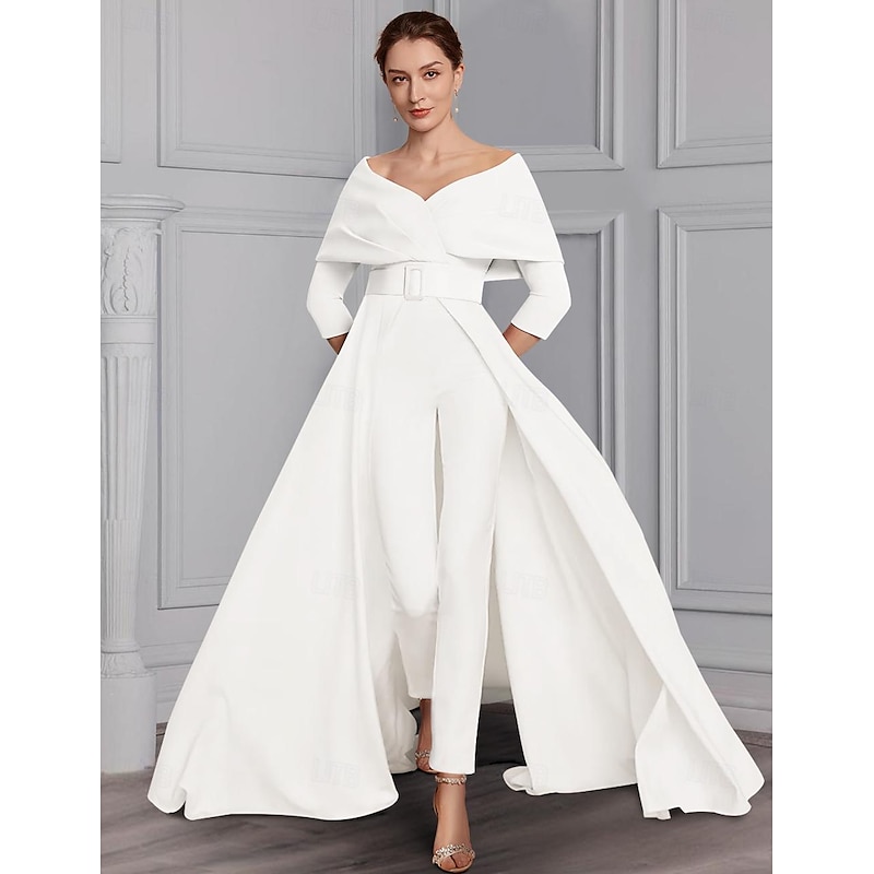 Jumpsuit Mother of the Bride Formal Wedding Guest Elegant Party Scoop Neck Off Shoulder Ankle Length Stretch Fabric 3/4 Length Sleeve with Sash / Ribbon 28