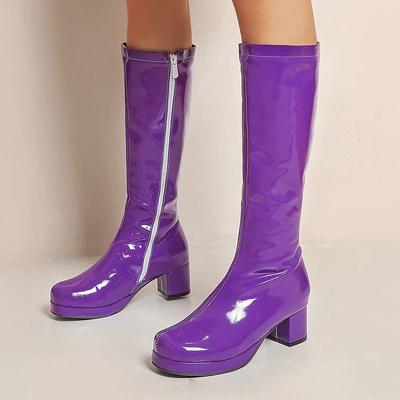 Women's White Patent Knee-High Platform Boots with Side Zipper - Vintage 70s Disco Style Chunky Heel Boots for Cosplay, Retro Fashion, and Events 19