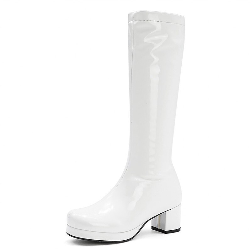HOT ! Women's White Patent Knee-High Platform Boots with Side Zipper - Vintage 70s Disco Style Chunky Heel Boots for Cosplay, Retro Fashion, and Events