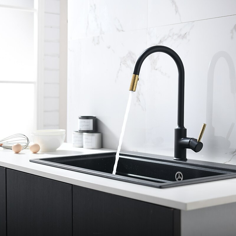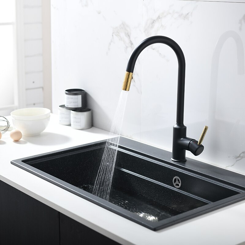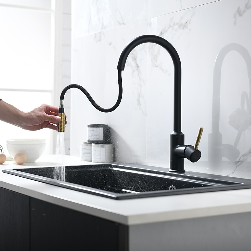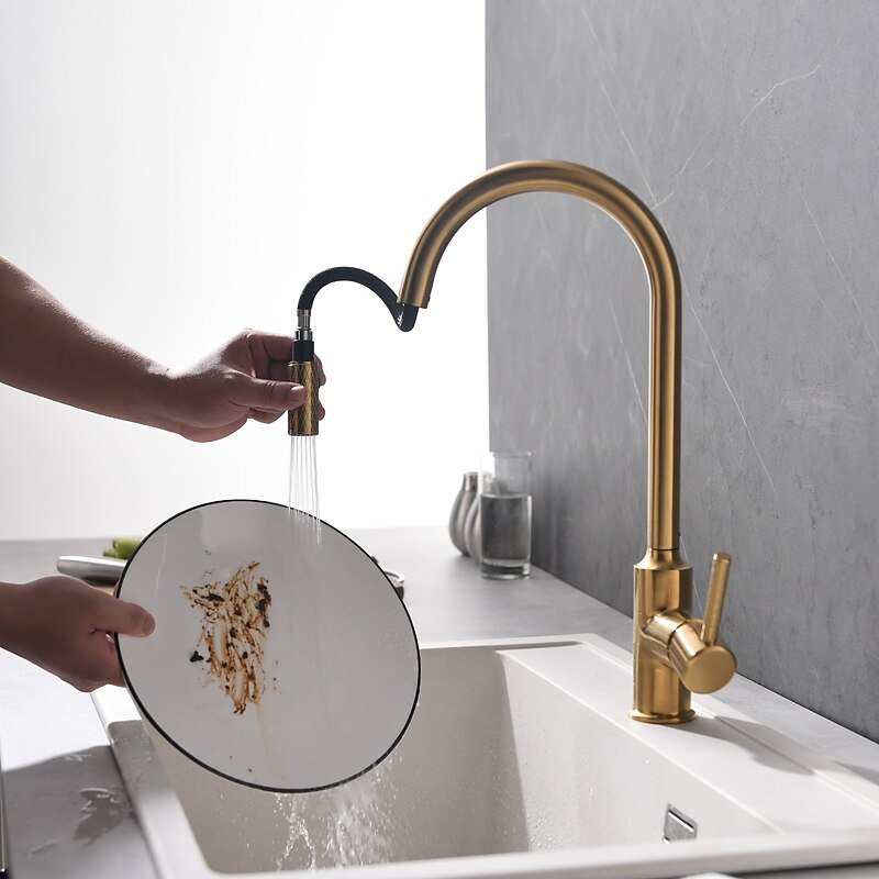 Kitchen Sink Mixer Faucet Pull Out, Single Lever Handle Brushed Solid Brass Taps Cold Hot Hose, One Hole with Pull Down Sprayer Black Gold Faucets 1