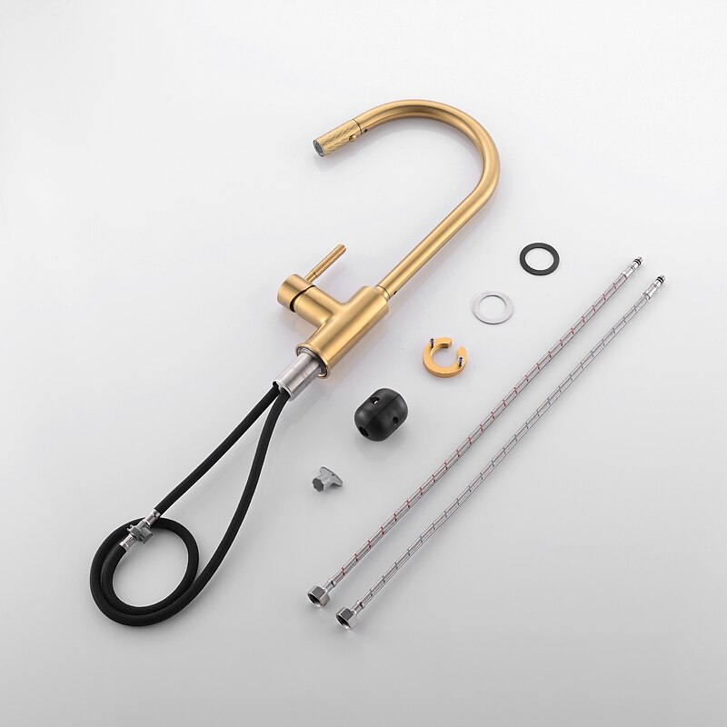 Kitchen Sink Mixer Faucet Pull Out, Single Lever Handle Brushed Solid Brass Taps Cold Hot Hose, One Hole with Pull Down Sprayer Black Gold Faucets 9