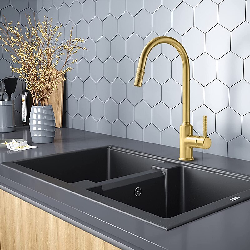 Kitchen Sink Mixer Faucet Pull Out, Single Lever Handle Brushed Solid Brass Taps Cold Hot Hose, One Hole with Pull Down Sprayer Black Gold Faucets 11