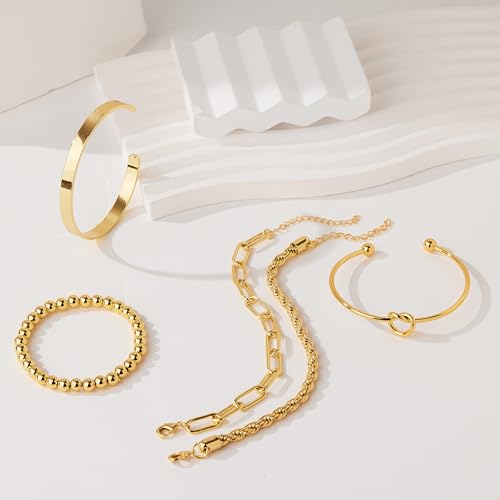 HOT ! Gold Bracelets for Women Non Tarnish, 14K Gold Plated Chunky Cuff Bracelet Gold Bangles Bracelet for Women Trendy Tie Knot Cuban Rope Paperclip Beaded Bracelet Stack Jewelry Gifts