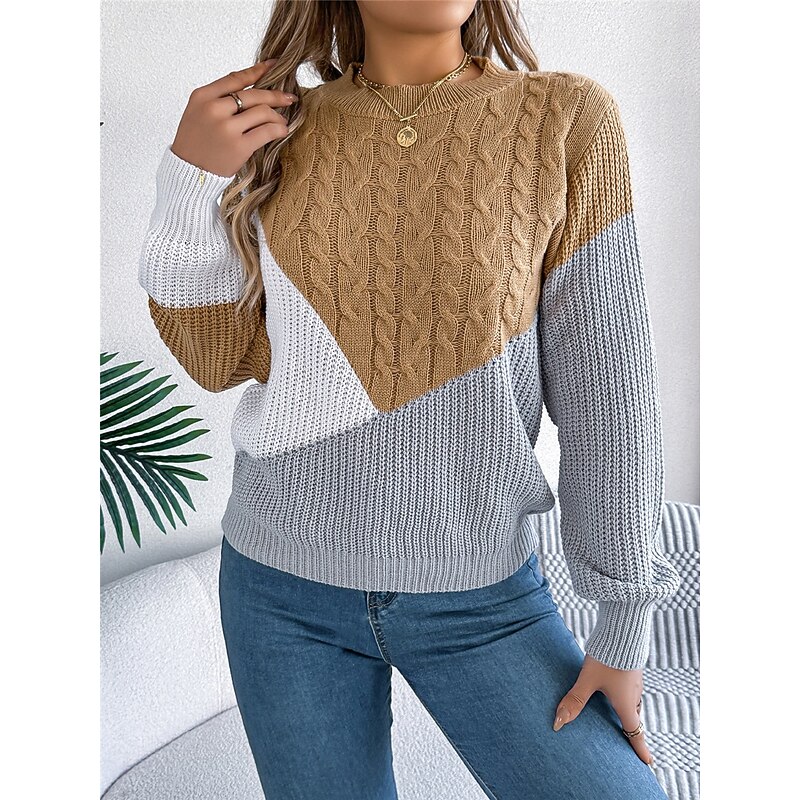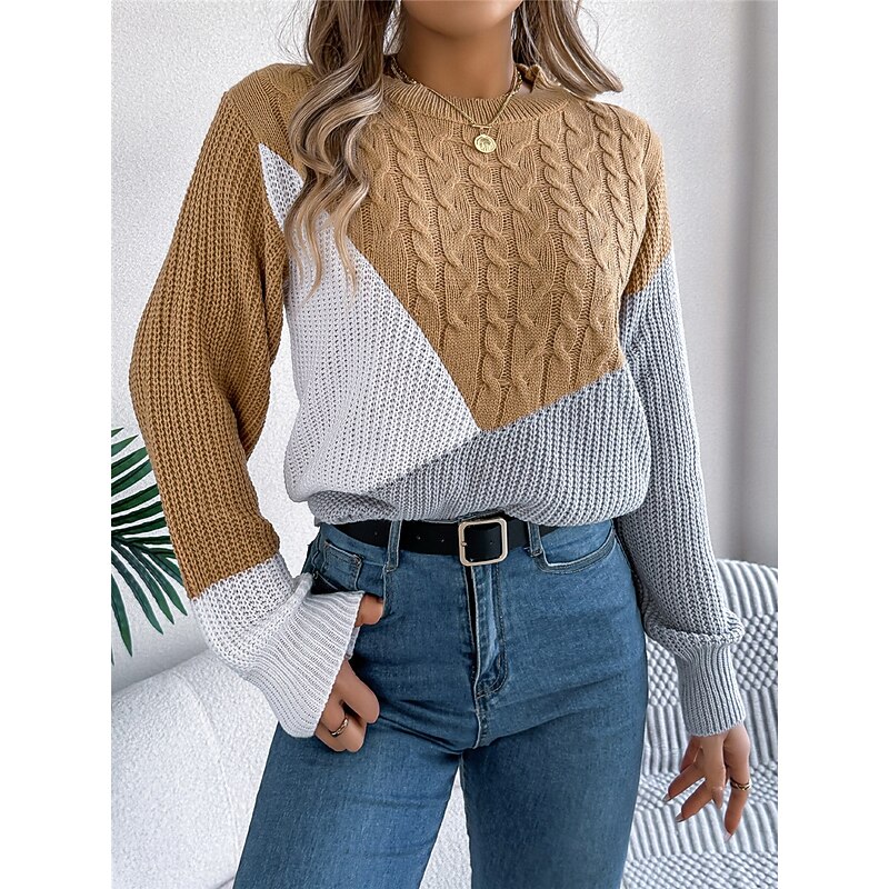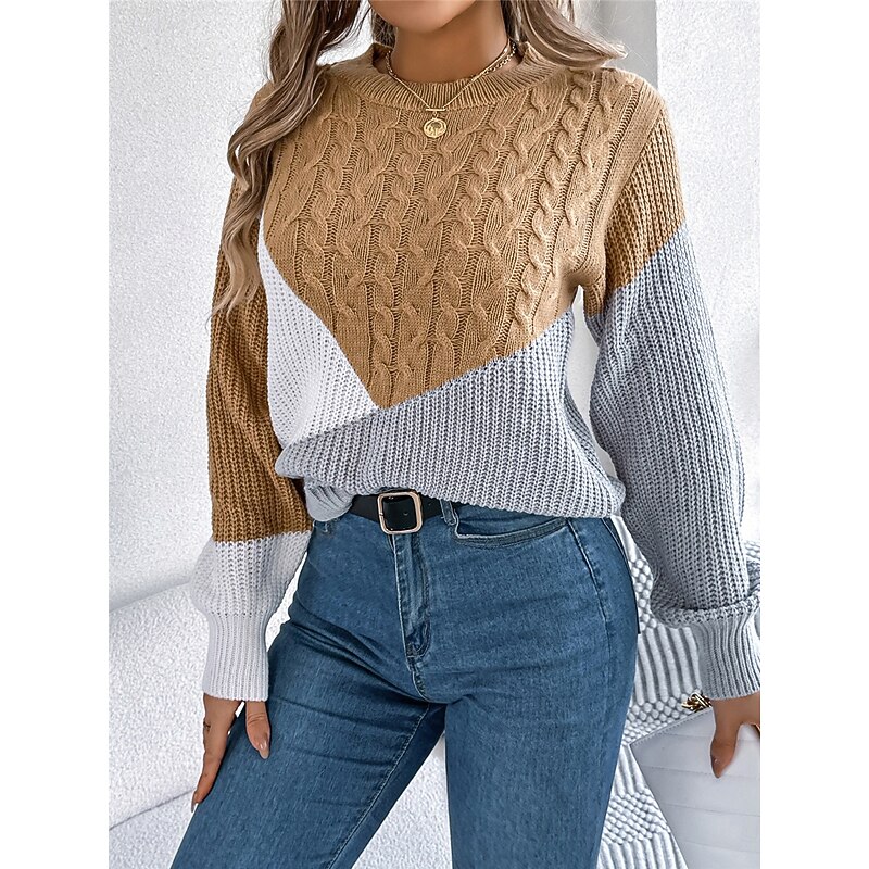 Highlights [Fabric] : Crafted from high-quality acrylic, this sweater offers a soft, comfortable feel ideal for fall and winter. The micro-elastic knit ensures warmth while allowing for ease of movement. [Fit and Design] : Designed for a loose fit, this pullover sweater features a regular top length and a classic crew neck. The ribbed knit style is complemented by a color-block pattern, blending shades of black, pink, and khaki for a contemporary look. [Design Highlights] : The sweater showcases a cable-knit pattern on the front and sleeves, adding texture and elegance. Ribbed cuffs and hem provide a snug fit, ensuring that the sweater retains its shape while adding a touch of sophistication. [Occasions] : Perfect for daily wear, outdoor activities, and weekend outings, this versatile sweater can be dressed up or down. Pair it with jeans or skirts for a casual look, or match it with tailored pants for semi-formal occasions. [Size] : Available in sizes S, M, L, and XL, this sweater caters to a wide range of body types, ensuring a comfortable fit for everyone.
