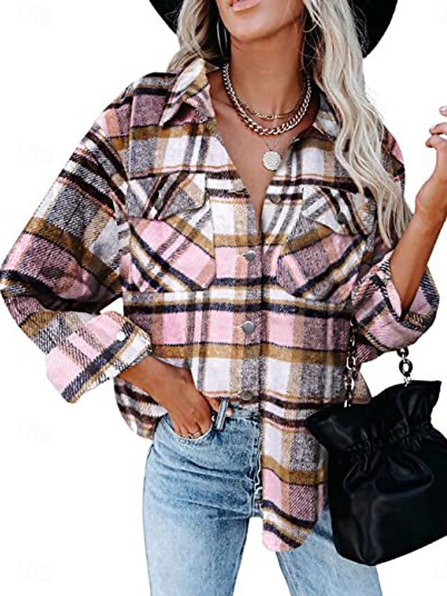 More information about Women's Blouse Plaid Casual Long Sleeve V Neck Daily Pink Blue Gray Spring Fall