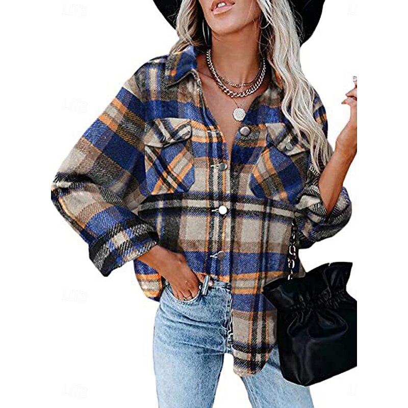 Crafted from a cozy, woven blend, this women's plaid blouse offers both warmth and comfort, making it perfect for the transitional seasons of spring and fall. The fabric combines vibrant hues of blue, pink, and gray in a classic checkered pattern, giving it a lively, eye-catching appeal.