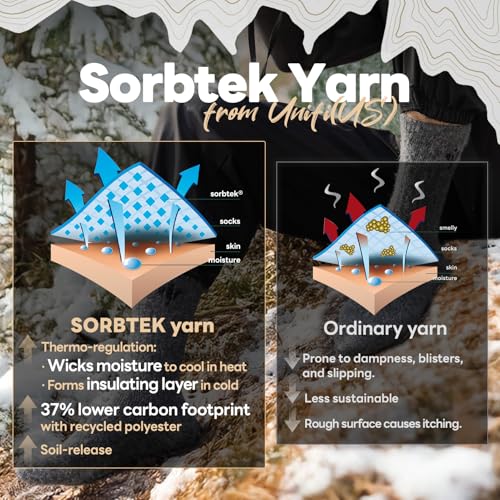 • 【Dry Comfort】Renowned for moisture control, hollow‑core alpaca fibers wick and regulate temperature, absorbing up to 30% moisture and drying faster than many fabrics. Sorbtek yarn by Unifi (USA) speeds transport to keep feet drier and fresher. Breathability helps reduce odor and foot fatigue, sustaining comfort through temperature swings. Whether hiking, hunting, skiing, or relaxing, these thermal winter socks keep you comfortable all day.