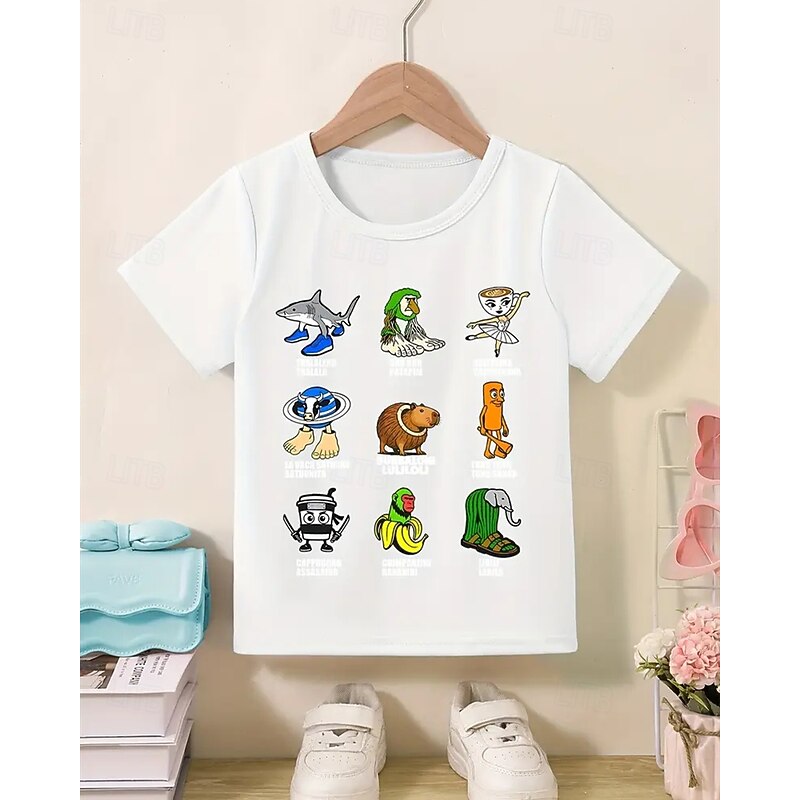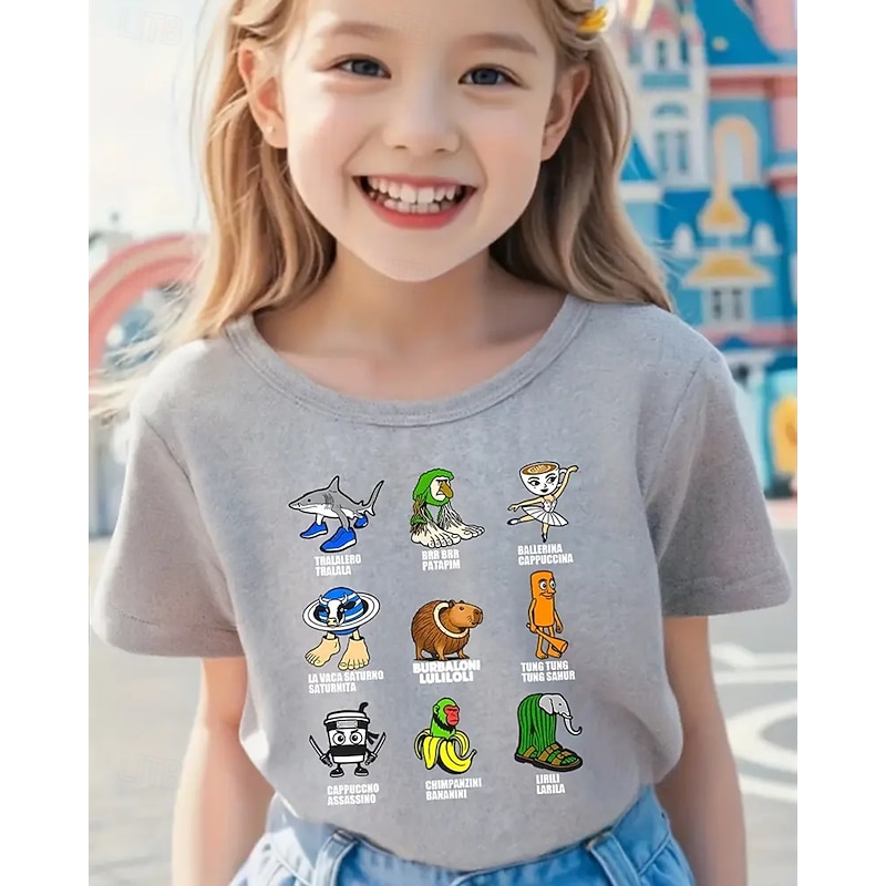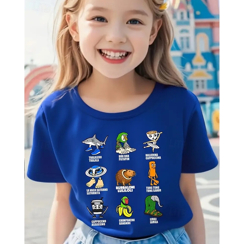 HOT ! Girls' Funny Italian Brainrot Graphic Tee - Lightweight Stretchy T-Shirt with Lightweight Stretchy Fabric for Ages 4-12 Casual Everyday & Birthday Party Outfit Children's Summer Shirt Playful Kids A
