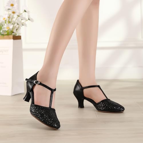 Women Latin Dance Shoes Sequin Closed Toe T-Strap Ballroom Salsa Tango Party Performance Dance Shoes,Model FT-135