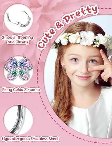 • Earrings for Girls--Come with 12 pairs girls earrings, include 10 pairs screw back stud earrings(star girl earrings, flower earrings for girls, pink cz kid earrings, butterfly toddler earrings, rainbow stud earrings ect), 2 pairs small huggie hoop earrings, 12 different style offer a unique and eye-catching look