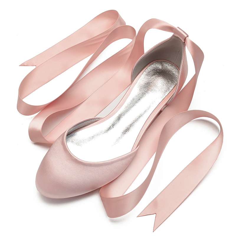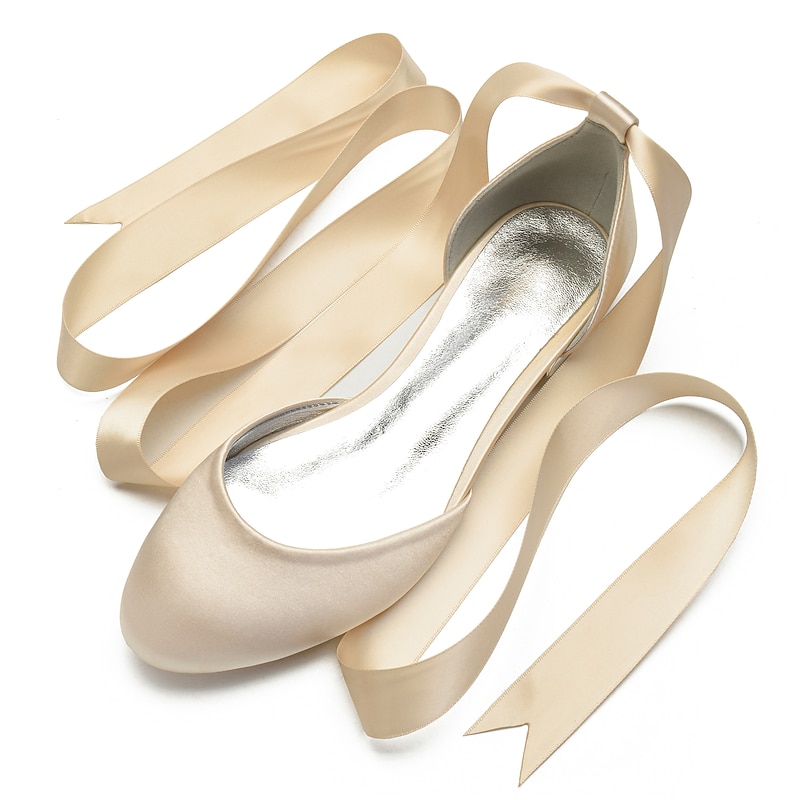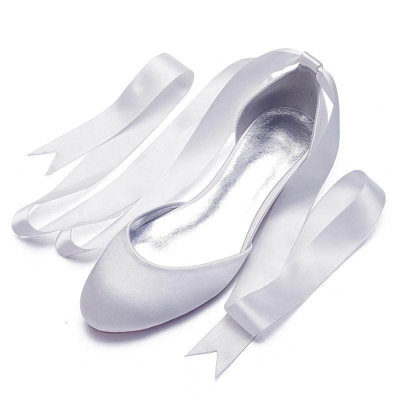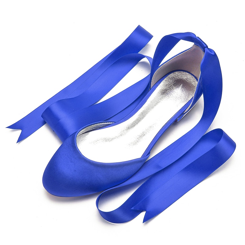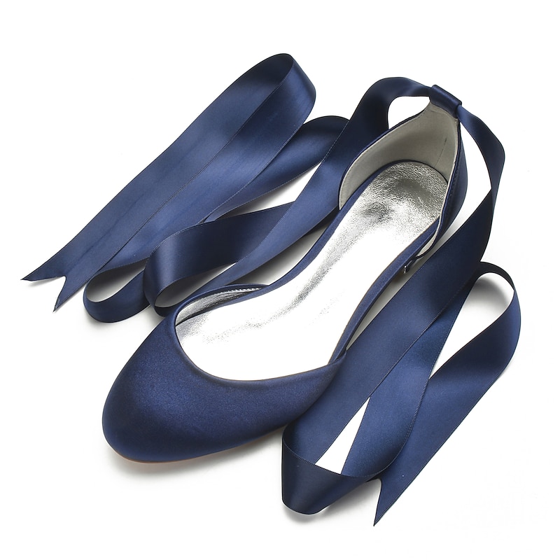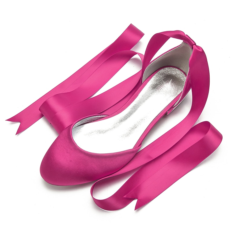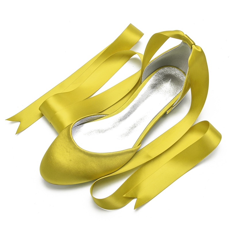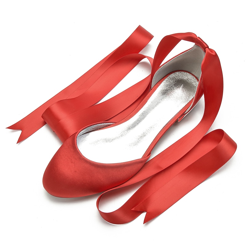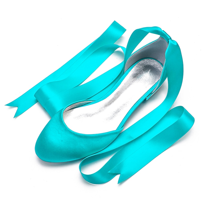 Highlights [Fabric] : Crafted from luxurious satin, these women's ballet flats offer a silky and smooth finish that exudes elegance and sophistication. The satin upper provides a rich texture, setting a high standard for comfort and style. [Fit] : Featuring a classic round toe design, these flats ensure a comfortable fit while maintaining a timeless and stylish look. The flat heel type further enhances comfort, making them suitable for long periods of wear. [Design Highlights] : The standout feature of these ballet flats is the long green satin ribbons that lace up and wrap elegantly around the ankle. This design adds a feminine and sophisticated touch, while the shiny metallic interior lining introduces a contemporary edge. [Occasions] : Perfect for weddings and special occasions, these flats are a versatile choice for adding a chic and elegant touch. Whether attending a formal event or looking to elevate a casual outfit, these shoes meet a variety of style needs. [Size] : Available in a wide range of sizes from 36 to 44, these ballet flats cater to diverse foot sizes, providing an option for every woman seeking elegance and comfort.