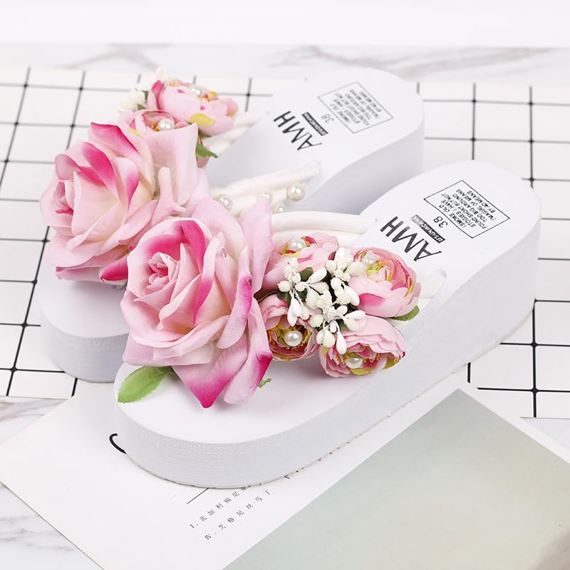 Loizziuy Black Floral Slippers Summer Women's Sandals Elevated Heels Thick-Soled Platform Handcrafted Rose Flower Decor for The Beach 5