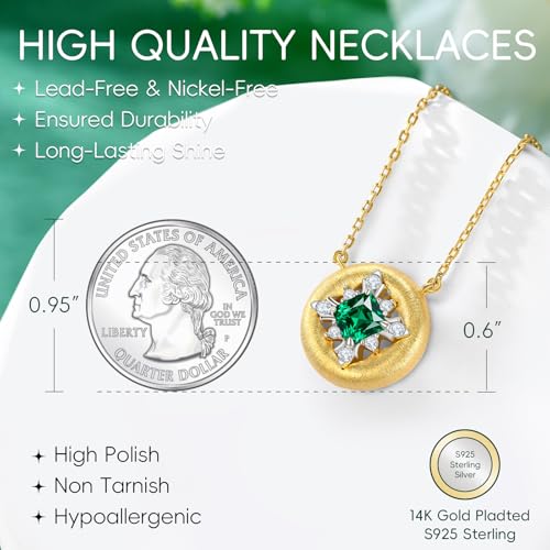 • 【Fashion Design】- This exquisite women's necklace features a 0.6*0.6 inch golden pendant adorned with intricate hairline detailing. Centered with a captivating 0.5-carat lab-grown emerald, it's surrounded by eight sparkling moissanite stones, exquisitely arranged in a snowflake design. It symbolizes the promise: "Just like this snowflake, you are one-of-a-kind – there's only one you in my world."