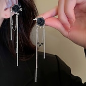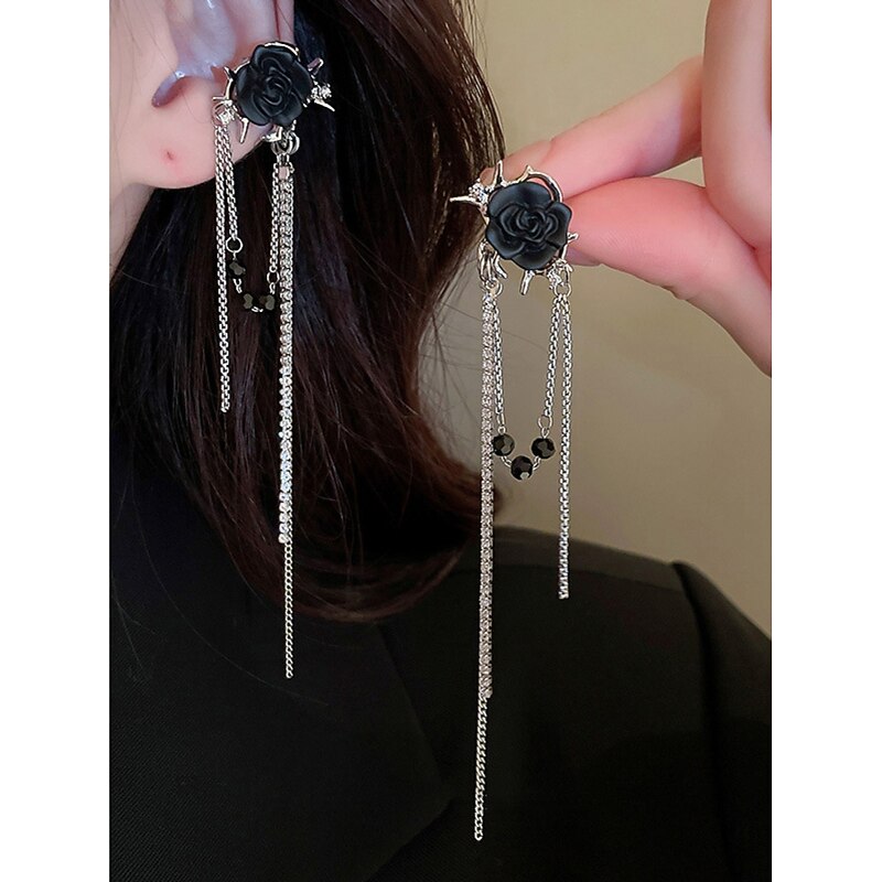Highlights [Fabric & Material] : Crafted from high-quality alloy, these earrings feature a glossy, sophisticated black rose detail at the center. The robust alloy construction ensures durability while retaining a dazzling appearance. [Design & Highlights] : The earrings showcase a striking gothic design with metallic thorn-like accents surrounding the centered rose, giving it a unique, edgy flair. Dangling from the rose are multiple delicate chains of varying lengths, which are adorned with small black bead embellishments, creating a dynamic, cascading effect that adds movement and enhances the overall aesthetic. [Occasions] : These earrings are perfect for party evenings, birthdays, and dates. They are designed to make a bold fashion statement, adding dramatic flair and elegance to any ensemble. [Style & Shape] : Combining elements of drops and geometric shapes, these earrings exhibit a sweet yet fashionable style, suitable for those looking to incorporate a cute and elegant accessory into their wardrobe. [Size Notice] : Available in a standard size suitable for women's wear, these earrings are designed to complement a variety of outfits and occasions seamlessly.