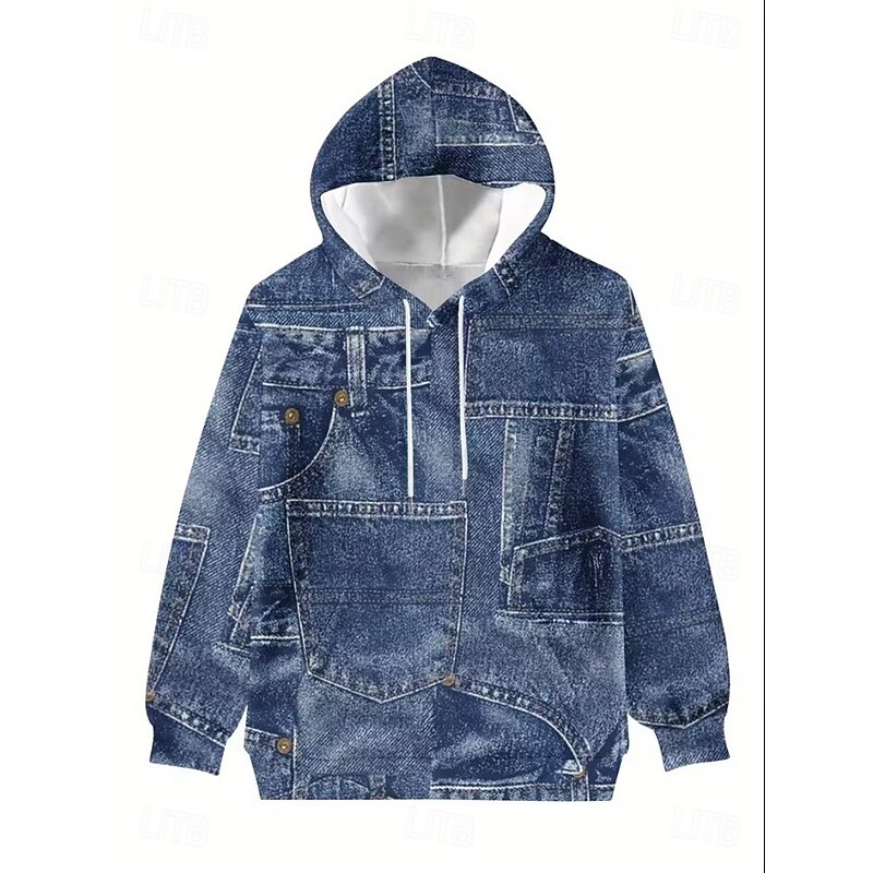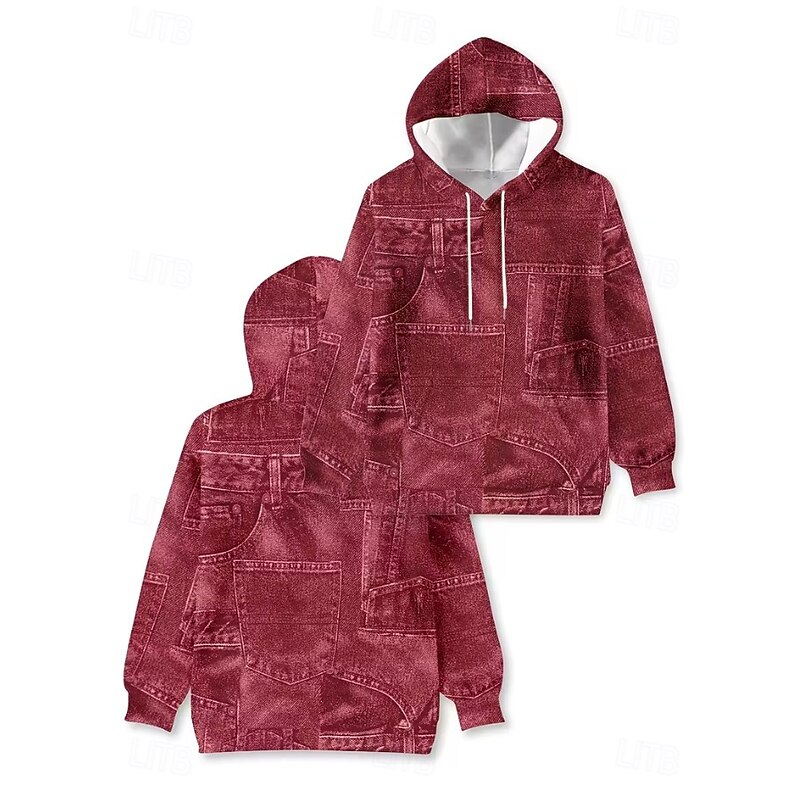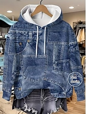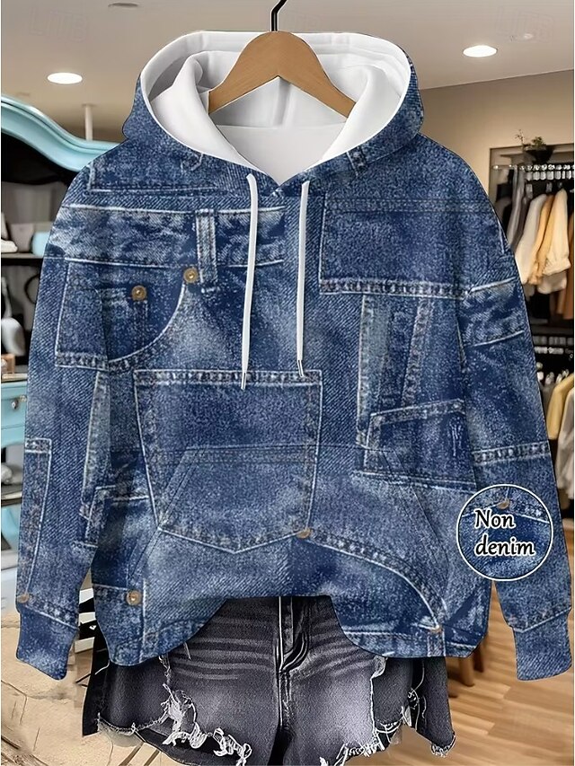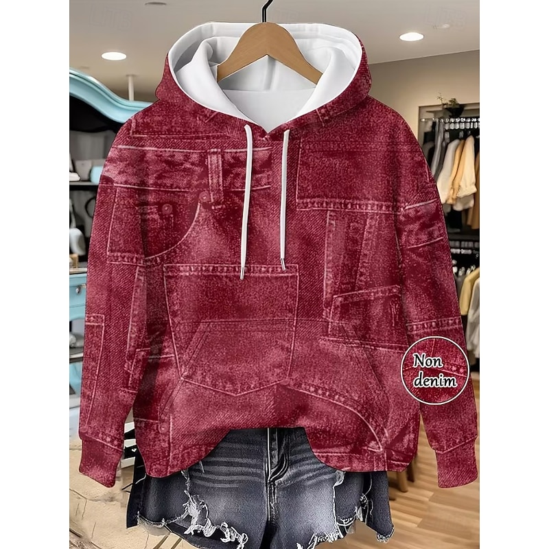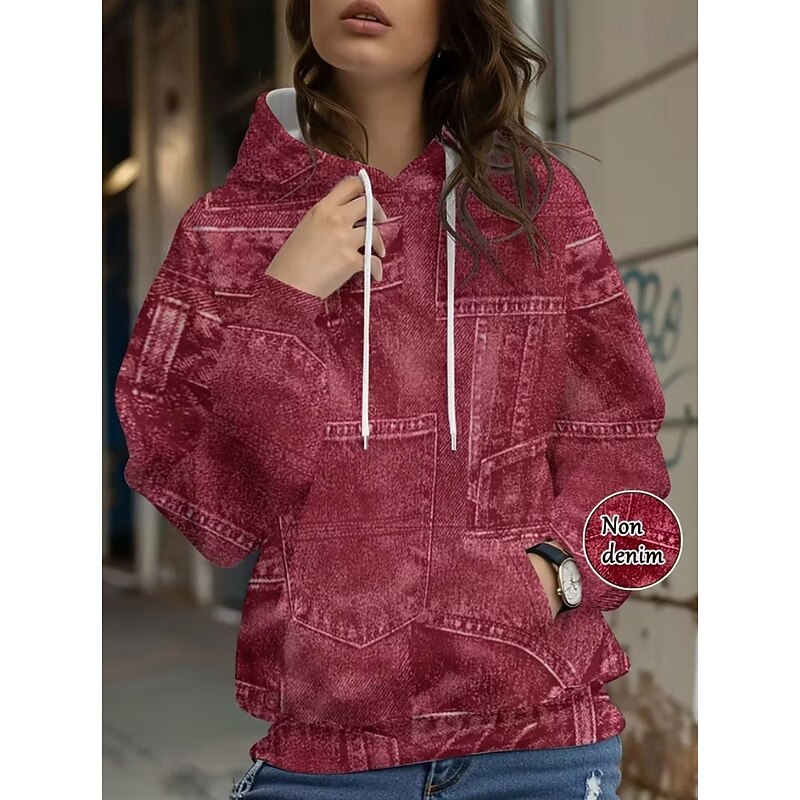 Women's Pullover Hoodie Sweatshirt Graphic Geometric Punk Active Vintage Long Sleeve Hooded Regular Tops Street Dailywear Print Front Pocket Denim Blue Red Spring Fall Winter