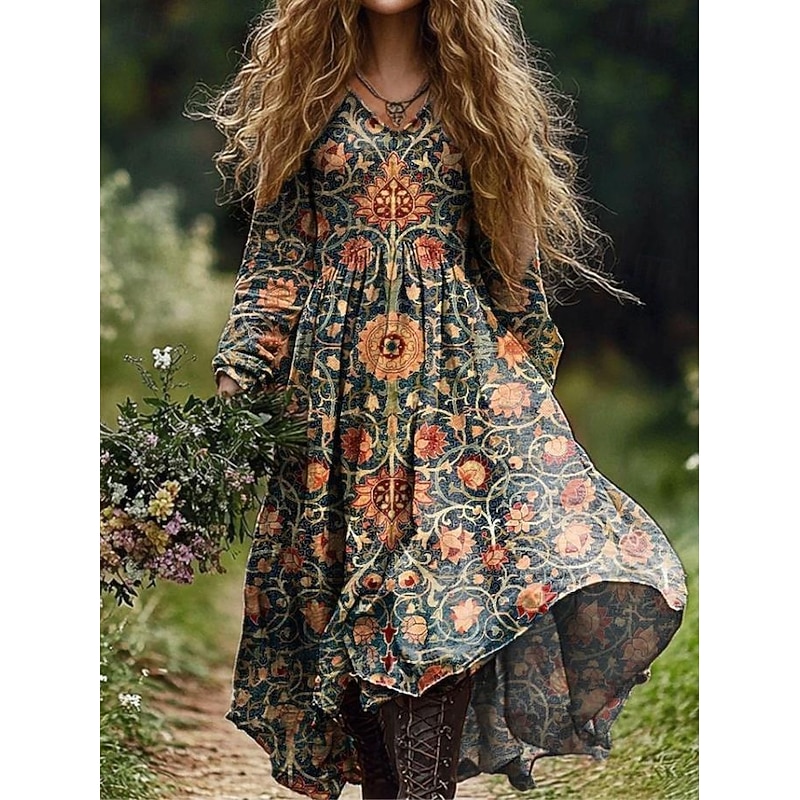 HOT ! Women's Maxi Dress Sundress Pleated Dress Vacation Casual Boho Going out Beach Standard Fit Graphic Paisley Long Sleeve V Neck Deep Green Black Red Blue Summer Spring