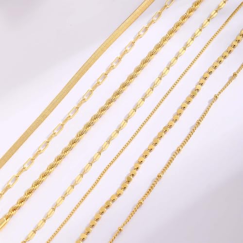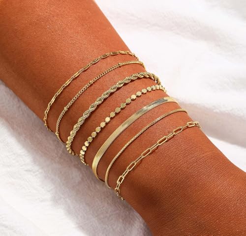 Material: CopperMetal type: BrassClasp type: Lobster ClawChain type: Bead ChainGem type: Cubic Zirconia7PCS GOLD BRACELETS: One Order Include:dot bracelet, snake bracelet, twist bracelet, paper clip bracelet, satellite bracelet, box bracelet, lip bracelet, ideal for both layering and solo wear, adding a touch of eleganceBracelets Size: Gold bracelet measures 6.3 inches long plus 1.2 inches of adjustable extender chain,with a sturdy lobster clasp, you can easily adjust the braclets length by yourself, make sure to fit different figures,this gold bracelets suitable for womenHigh Quality Material: Comes in 14k real gold plated with a shiny lifetime protective finish, Special color preservation measures have been taken, which will tarnish-resistant then can't be faded in a long time, Nickel free,lead free and hypoallergenicUnique Packaging and Occasions: These distinctive gold bracelets arrive in an adorable gift box, making them an ideal present for yourself or a loved one,They are perfect for any occasionService: If you have any problem, please feel free to contact us and we will solve them for you as soon as possible Perfect for everyday use. premium materials and excellent craftsmanship ensure long-lasting durability.