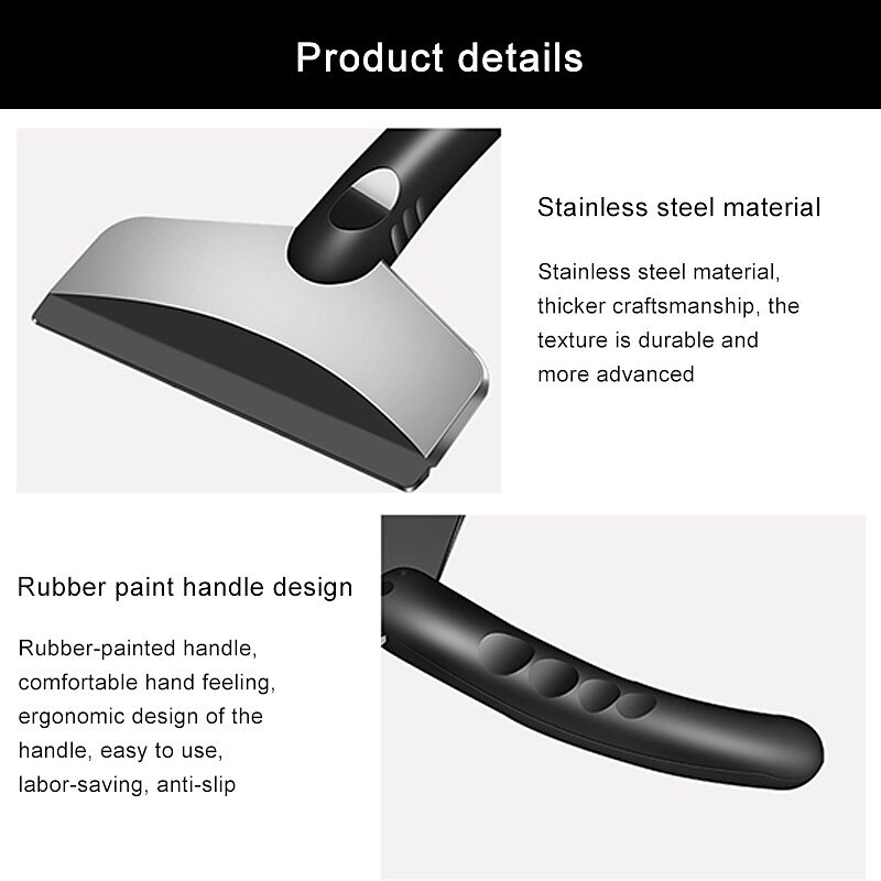 Highlights Product Selling Points: 1. Convenient and portable: This car ice scraper is designed to be easy to carry, making it convenient for use anytime, anywhere. 2. Efficient snow removal: The snow shovel is ergonomically designed, following the principle of mechanics, making it efficient and labor-saving for clearing snow from car windows, windshields, and windscreen. 3. Gentle on glass: Made of ABS material, this scraper is of moderate softness and hardness, ensuring that it will not leave any scratches on the glass surface. 4. Universal fit: This snow shovel is suitable for use with any car model, making it a versatile tool for all car owners. 5. Durable construction: The car ice scraper is made of high-quality materials, ensuring its durability and long-lasting performance. 6. Multi-purpose cleaning tool: Apart from snow removal, this scraper can also be used for deicing and cleaning, making it a versatile and practical tool for car maintenance. 7. Stylish design: The black handle adds a touch of elegance to the scraper's appearance, making it a stylish accessory for your car.