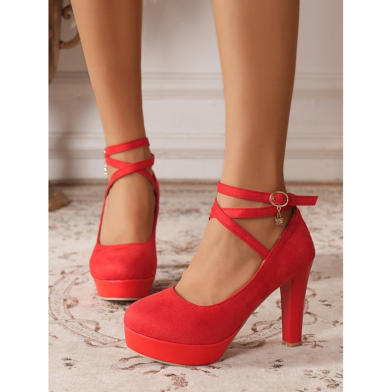 Highlights - Luxurious faux suede upper - Sleek synthetic leather lining - Stylish buckle embellishment - Sturdy and comfortable chunky heel - Classic round toe shape - Durable rubber outsole