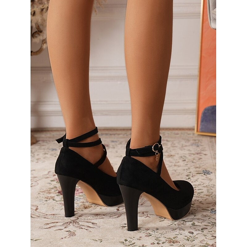 Women's 1950s Black Suede Platform Pumps with Ankle Strap and Crystal Charm – Stylish High Heel Shoes for Evening Parties and Formal Occasions 4