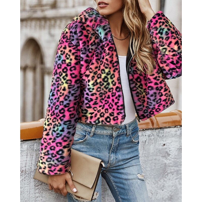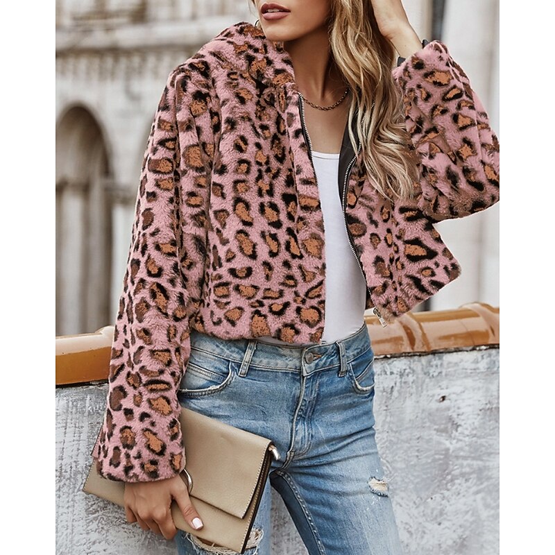 More information about Women's Jacket Faux Fur Coat Hoodie Jacket Warm Comfortable Zipper Furs & Leathers Casual Leopard Vacation Street Daily Going out Short Hooded Regular Fit Long Sleeve Outerwear Yellow Pink Green Fall