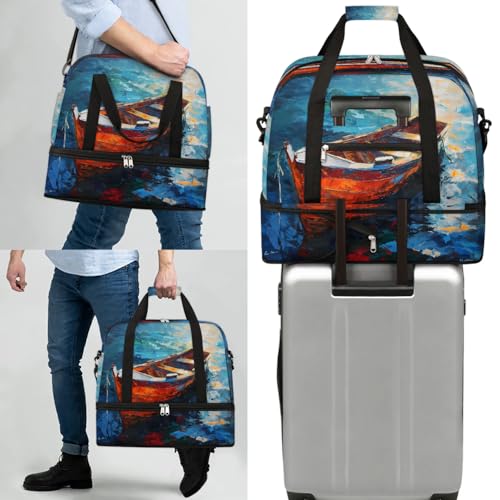 Travel Duffel Bags Oil Painting Boat Foldable Weekender Bags for Women with Shoes Compartment Waterproof & Tear Resistant Carry on Overnight Luggage Duffel Bag Shoulder Sports Tote Bag 4