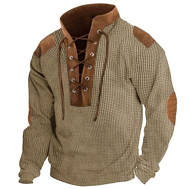 More information about Men's T Shirt Waffle Knit Tee Tee Top Long Sleeve Shirt Long Sleeve Standing Collar Spring & Fall Color Block National Flag Fashion Designer Basic Lace up Patchwork Vacation Street Going out Black
