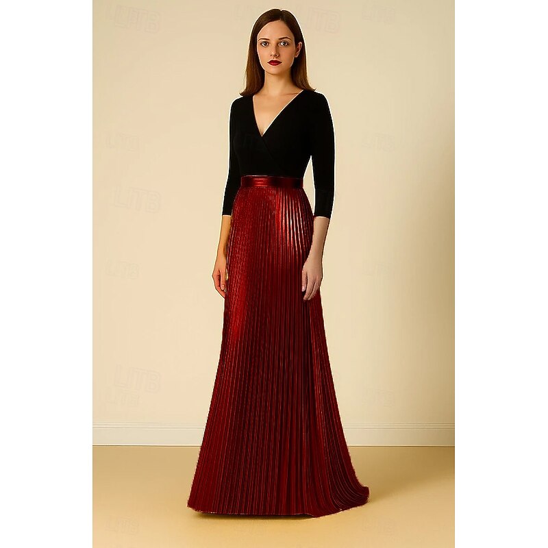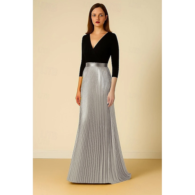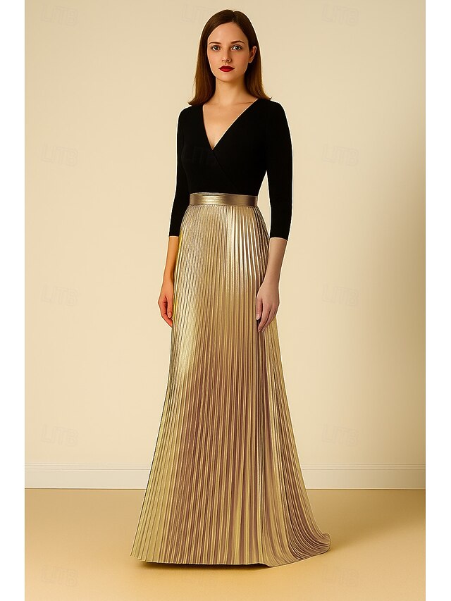 More information about Black and Gold Metallic A-Line Evening Gown Elegant Dress Formal Wedding Floor Length 3/4 Length Sleeve V Neck Stretch Crepe with Pleats 2025