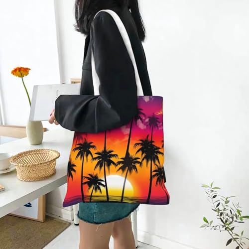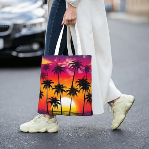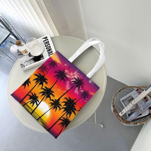 HOT ! Canvas Tote Bag for Women Shoulder Tote Purse Reusable Grocery Bag Palm Trees and Colorful Sunset Aesthetic Shopping Bags