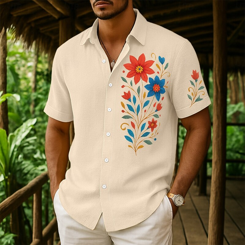 HOT ! Men's Shirt Linen Shirt Summer Shirt Beach Wear Button Up Shirt Floral Print Vacation Curise White Navy Blue Green Khaki Short Sleeve Collar Summer Spring & Summer Clothing Apparel