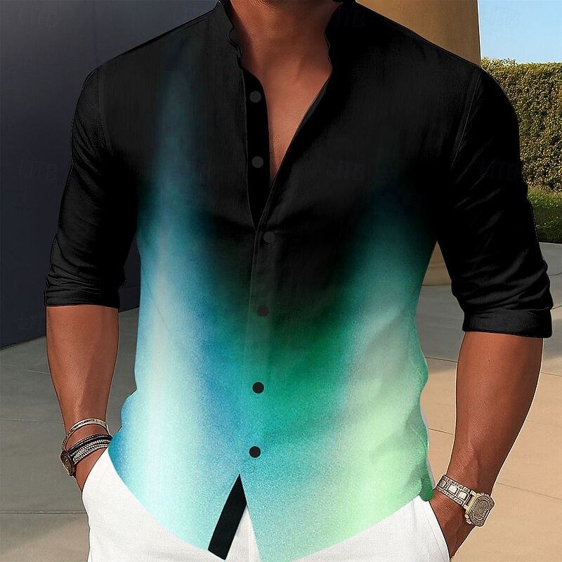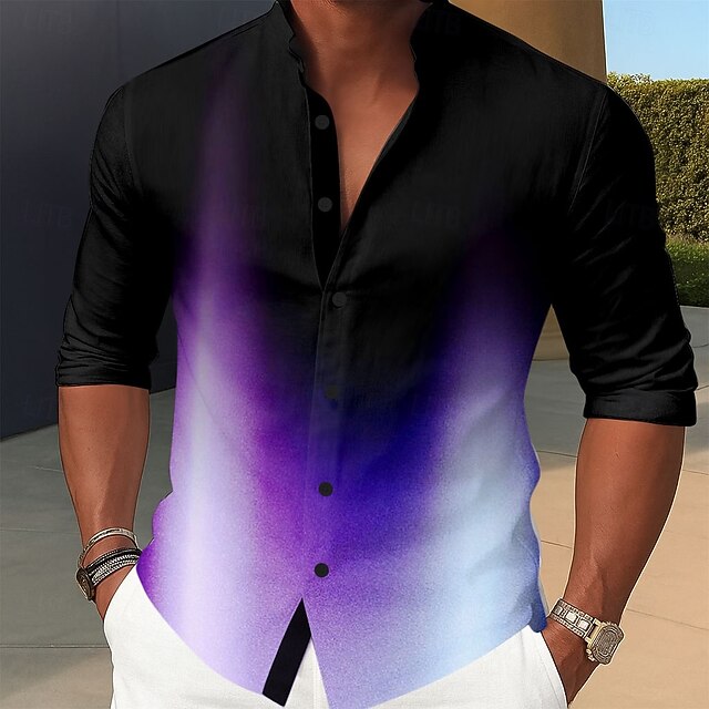HOT ! Men's Gradient Color Shirt Button Up Shirt Stand Collar Shirt Long Sleeve Casual Outdoor Vacation Daily Spring Fall Mandarin Collar Band Collar 3D Print Linen Like Shirt Pink Blue Purple Green