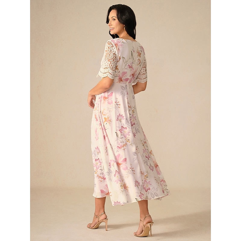 HOT ! Women's Wedding Guest Cocktail Dress Floral Lace Button V Neck Maxi Dress Elegant Stylish Party Short Sleeve Summer