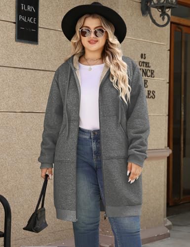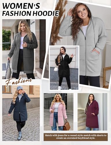 Plus Size Casual Zip Up Hoodie for Women, Long Tunic Fleece Jacket Coat, Warm Winter Hooded Outerwear 4