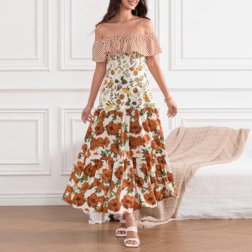 Fabric type: 100% PolyesterCare instructions: Machine WashOrigin: ImportedNeck style: One Shoulder NeckMaterial: Cocktail Dress for woman is made for comfortable fabric, different print patchwork, soft and not easily wrinkled, finely crafted.Design: Summer long dress features for short sleeves, off shoulder with elastic and ruffled, slim fit, large pleated hem. This dress is composed of three types of prints in the same color scheme, but they are not out of place.Features: The simple stripes, a variety of fruit prints, and the flowers blooming on the hem make this dress even more special. Wearing it spins like a print on a skirt, beautifully blooming and more charmingOccasions: Beach long dresses are suitable for many occasions, such as bonfire parties, dances, daily wear, leisure, shopping, music festivals, travel, vacations, dates, honeymoons, beaches, estates, markets, taking photos, etc.Size: Bohemia style maxi dress are available in three sizes: s, m, and L.